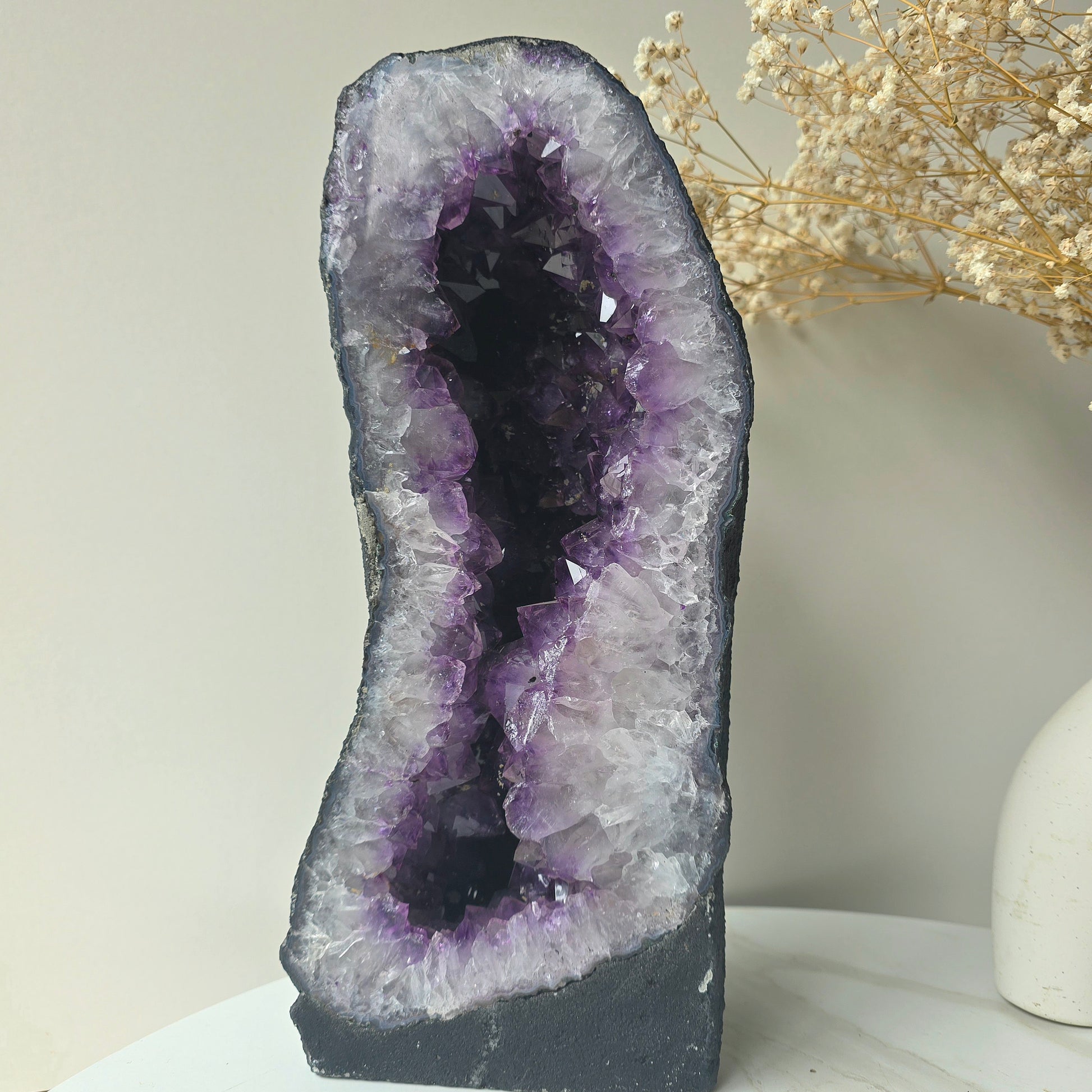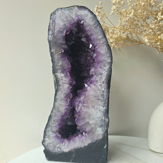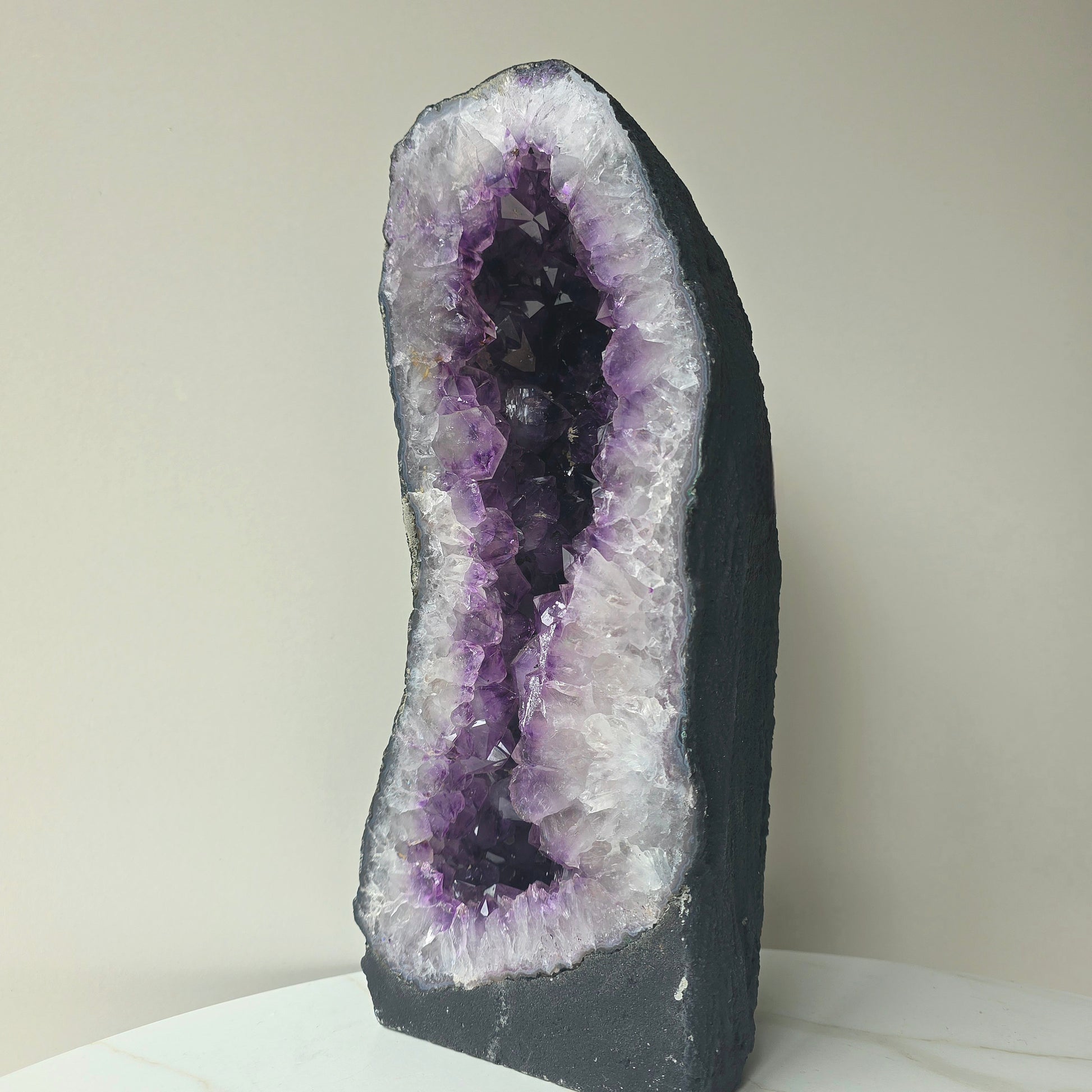 Majestic and commanding, an Amethyst Cave is more than a crystal — it is a centrepiece of energy. Formed over millions of years within volcanic rock, its interior reveals a breathtaking display of deep violet crystal points that radiate protective, calming frequency throughout a space.