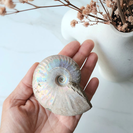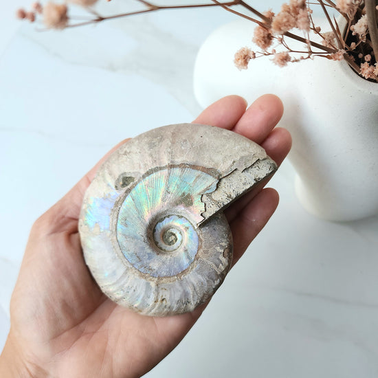 Ammonites, known for their spiral shape, have long been associated with change and positive movement. Due to the spiral structure, negative energy is drawn in, filtered through the chambers, and replaced with fresh, positive energy.