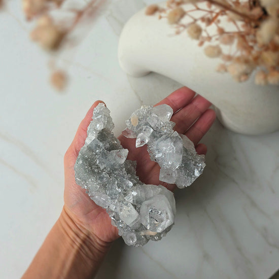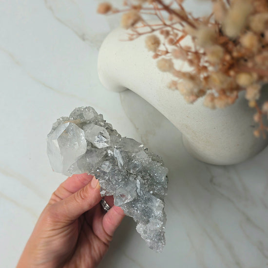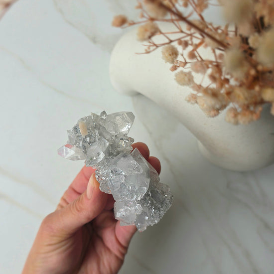 Illuminate your space with the radiant energy of Diamond Apophyllite. This stunning, rare exceptional-quality crystal sparkles with light and clarity, amplifying positive energy and uplifting the spirit. Known for its powerful connection to higher consciousness, Diamond Apophyllite helps clear negative energy, awaken intuition, and bring a sense of calm and spiritual alignment.