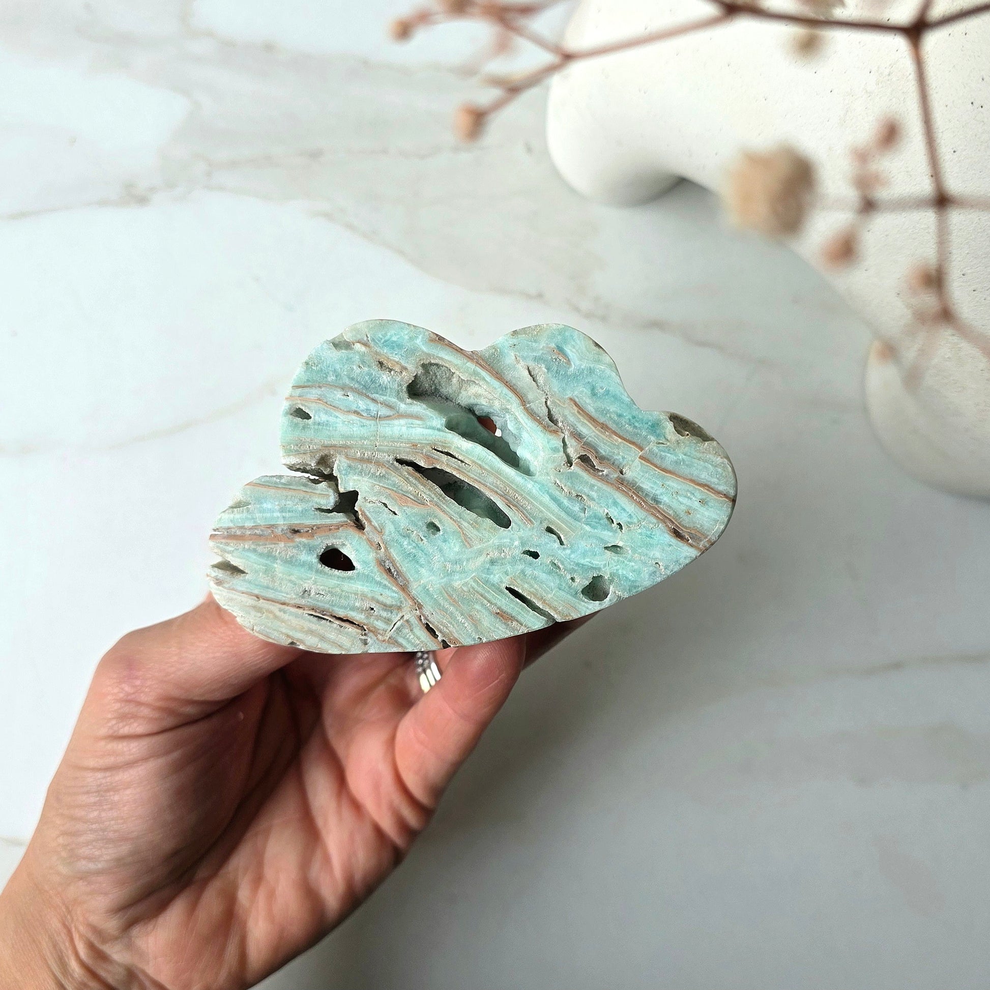 Blue Aragonite is a soothing stone of calm, communication, and emotional healing. With its dreamy ocean-blue hues, this crystal helps release stress, ease anxiety, and encourage heartfelt expression. Known as a crystal of compassion, it gently supports you in speaking your truth with clarity and kindness, while also deepening your connection to inner peace.