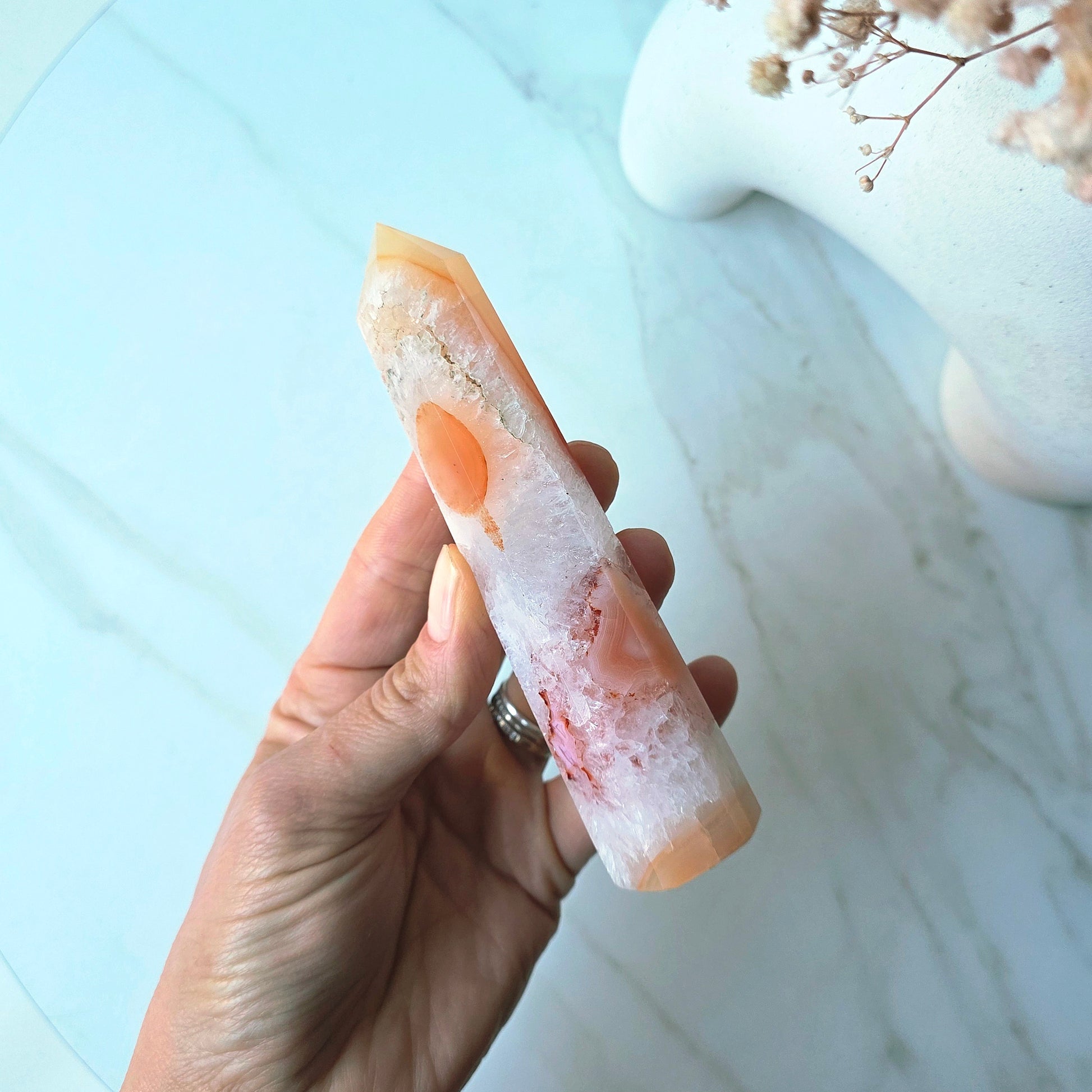 Carnelian is a warm, fiery orange crystal celebrated for its uplifting and energising vibration. Known as the stone of motivation, Carnelian ignites passion, creativity, and confidence, making it perfect for boosting drive and determination in both personal and professional goals. It is also believed to enhance courage, overcome self-doubt, and attract success and prosperity.