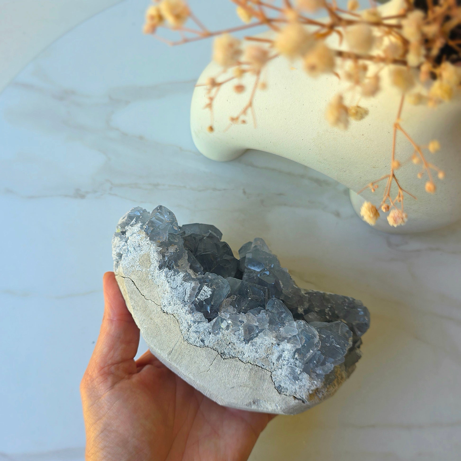 Celestite’s soothing frequency helps quiet the mind, ease anxiety, and promote clear communication—especially in moments of emotional or mental overwhelm. Its delicate beauty and calming presence make it ideal for bedrooms, altars, and sacred spaces.