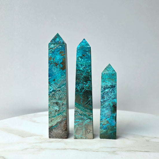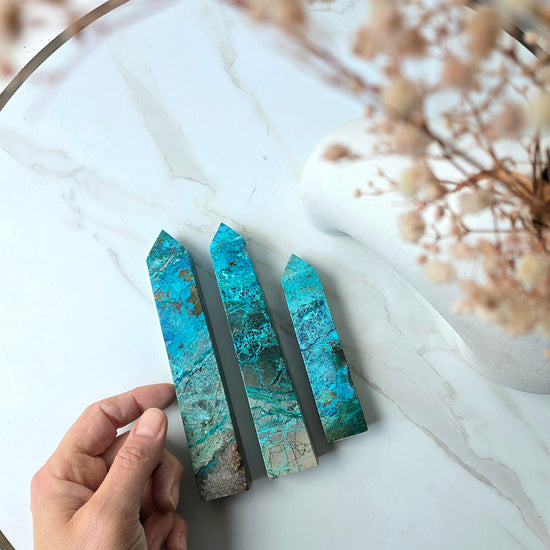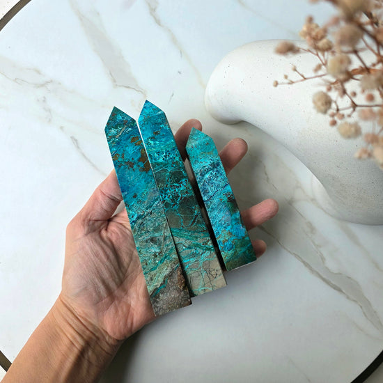 Chrysocolla is a gentle yet powerful crystal known for its soothing energy and vibrant blue-green tones. Often called the Stone of Communication, Chrysocolla encourages truth, compassion, and clarity in self-expression. Its calming presence helps release stress, ease emotional blockages, and restore inner balance—making it an ideal crystal for meditation, healing spaces, and everyday mindfulness.