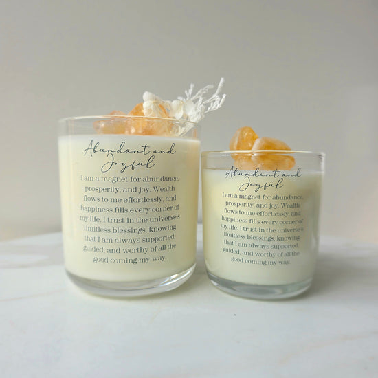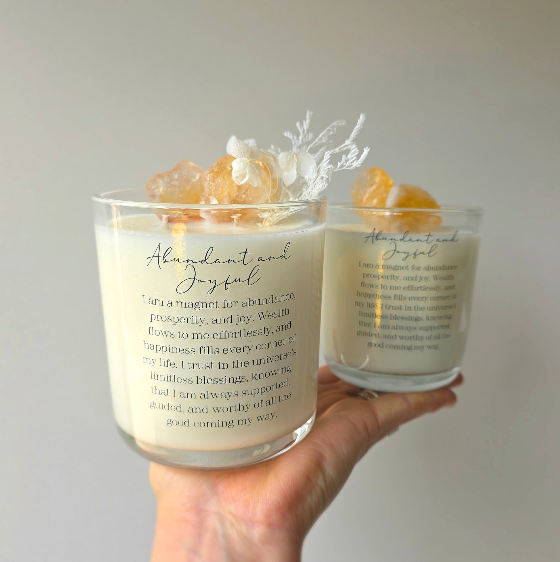 Each crystal is chosen intuitively for you, making every candle unique. Please note that variations in color, shape, and size may occur between batches.