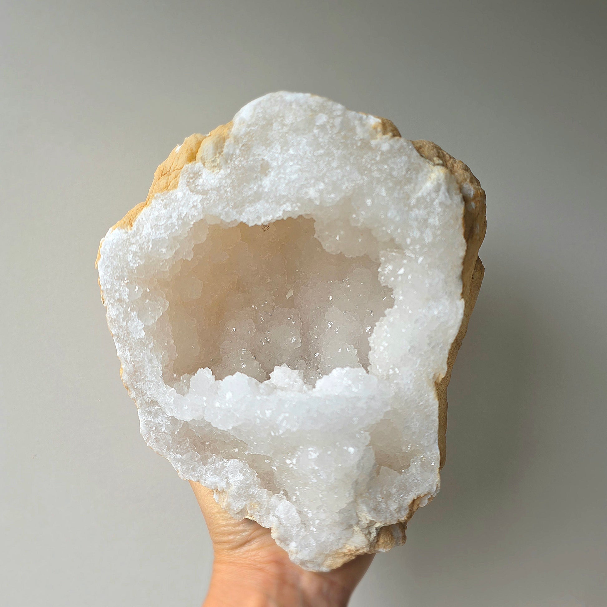 Illuminate your space with the pure, radiant beauty of our Moroccan Clear Quartz Geode. Ethically sourced from the deserts of Morocco, this stunning natural formation sparkles with crystal-clear points that capture and reflect light like frozen starlight. Known as the Master Healer, Clear Quartz amplifies energy, enhances clarity, and harmonizes your surroundings—making it the perfect centerpiece for both spiritual spaces and modern home décor.