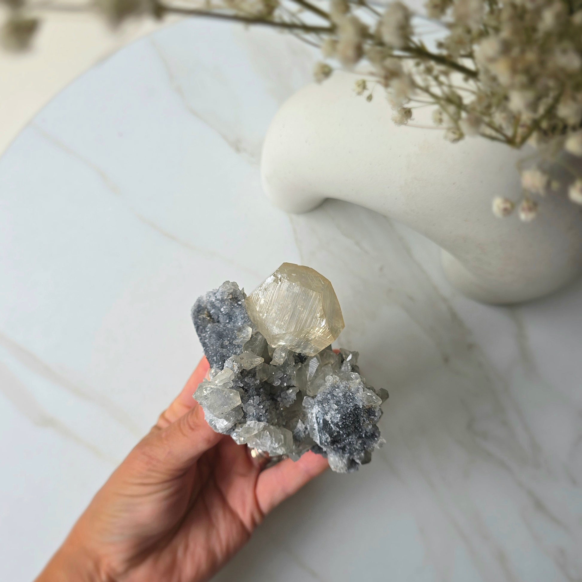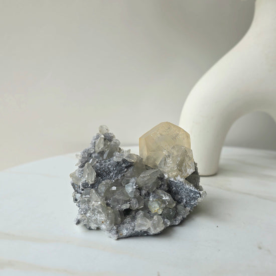 Energetically, this crystal combines the uplifting clarity of calcite with the stabilising, protective nature of black chalcedony. Together, they support mental focus, emotional balance, and grounded spiritual insight—making this an exceptional piece for collectors, meditators, and statement displays.