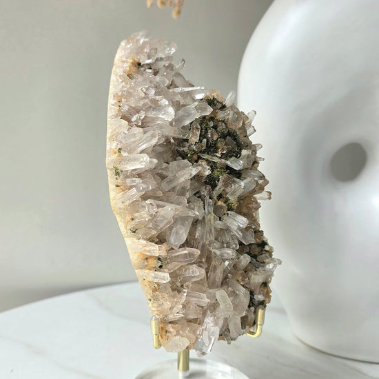 The delicate green Epidote inclusions ripple through the clear quartz like nature’s own brushstrokes, symbolising renewal, healing, and the courage to evolve. Together, they create a crystal that raises your vibration while helping you stay grounded, aligned, and open to growth.