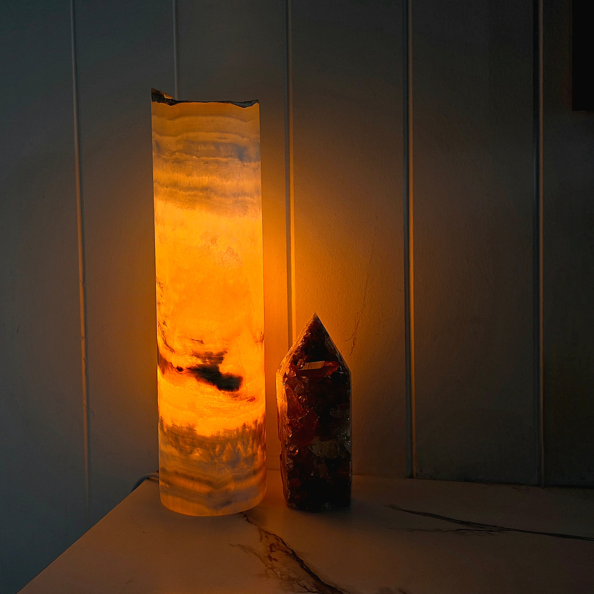 Illuminate your space with the grounding beauty of our Onyx Crystal Home Decor Lamp — a stunning fusion of natural crystal energy and ambient light. Each lamp is carved from genuine onyx, known for its deep, mesmerizing layers of cream, honey, and gold tones that glow beautifully when lit. The warm, soothing light radiates through the stone, creating a calming atmosphere that promotes balance, focus, and inner peace.