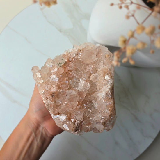Bathe your space in the serene energy of the mountains with our Pink Himalayan Quartz Crystal Clusters — radiant formations born high in the majestic Himalayan ranges. Each cluster shimmers with a soft blush hue, symbolising love, peace, and emotional clarity. Revered for their gentle yet powerful vibration, these crystals are known to open the heart, encourage self-compassion, and invite a deep sense of calm. Their soothing energy makes them perfect for meditation, energy work, or simply adding an ethereal glow to your home décor.