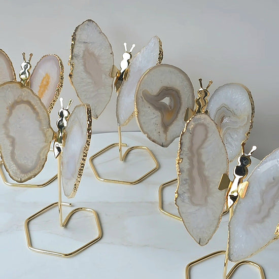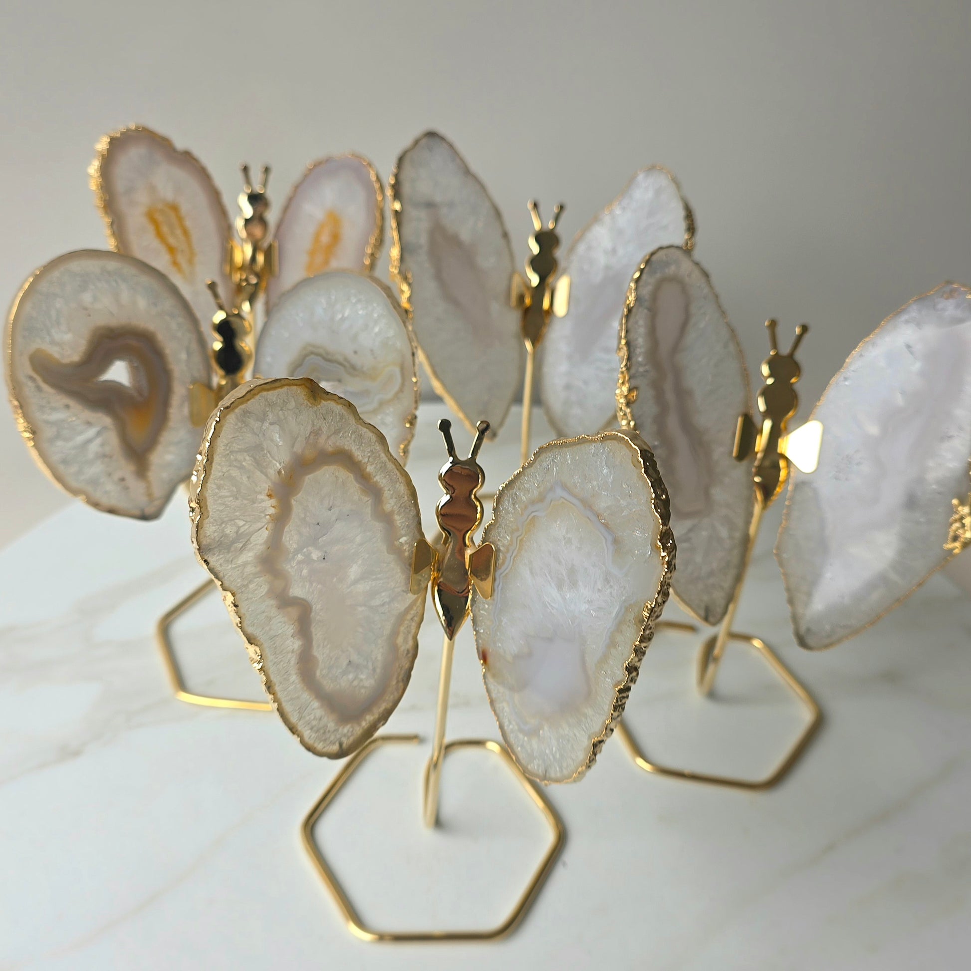 Graceful and symbolic, the White Agate Crystal Butterfly represents transformation, purity, and emotional balance. Carved from natural white agate, this delicate butterfly features soft milky tones and gentle banding, making each piece uniquely beautiful and soothing to the eye.