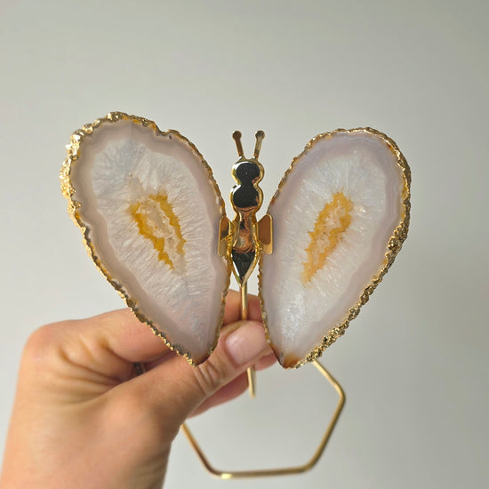 White Agate is known for its calming and stabilising energy, helping to ease stress, promote clarity, and restore emotional harmony. The butterfly shape enhances its meaning—symbolising growth, renewal, and new beginnings—making this piece both visually meaningful and energetically supportive.